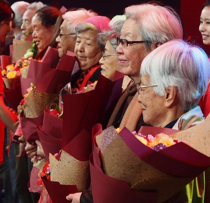 一批德高望重的老教师被授予荣誉奖项,并接受学生献花。