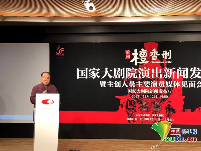 中国青年网北京11月12日电(记者 王龙龙)11月12日,歌剧《檀香刑》国家大剧院演出新闻发布会暨主创人员主要演员媒体见面会在国家大剧院举行。著名作家莫言,山东艺术学院党委书记马东骅,以及歌剧《檀香刑》主创团队成员、部分主要演员等出席发布会。