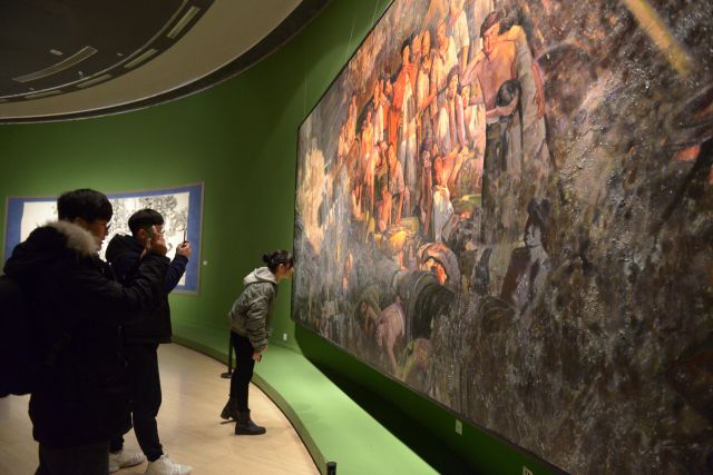 观众在山东艺术学院建校60周年美术作品展览现场观摩王力克的巨幅油画作品《甲午.1894》(11月22日摄) 。新华社发 (常秀芹 摄)
