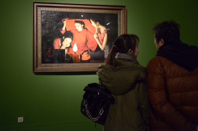 一对情侣在油画家王沂东的《红盖头》前探讨、欣赏(11月22日摄) 。 新华社发 (常秀芹 摄)