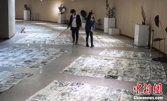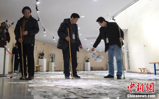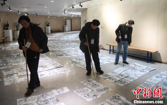 山东艺术学院美术校考阅卷工作在济南长清校区进行,评委们手持竹竿对万余张考生画作评点分档,场面壮观。
