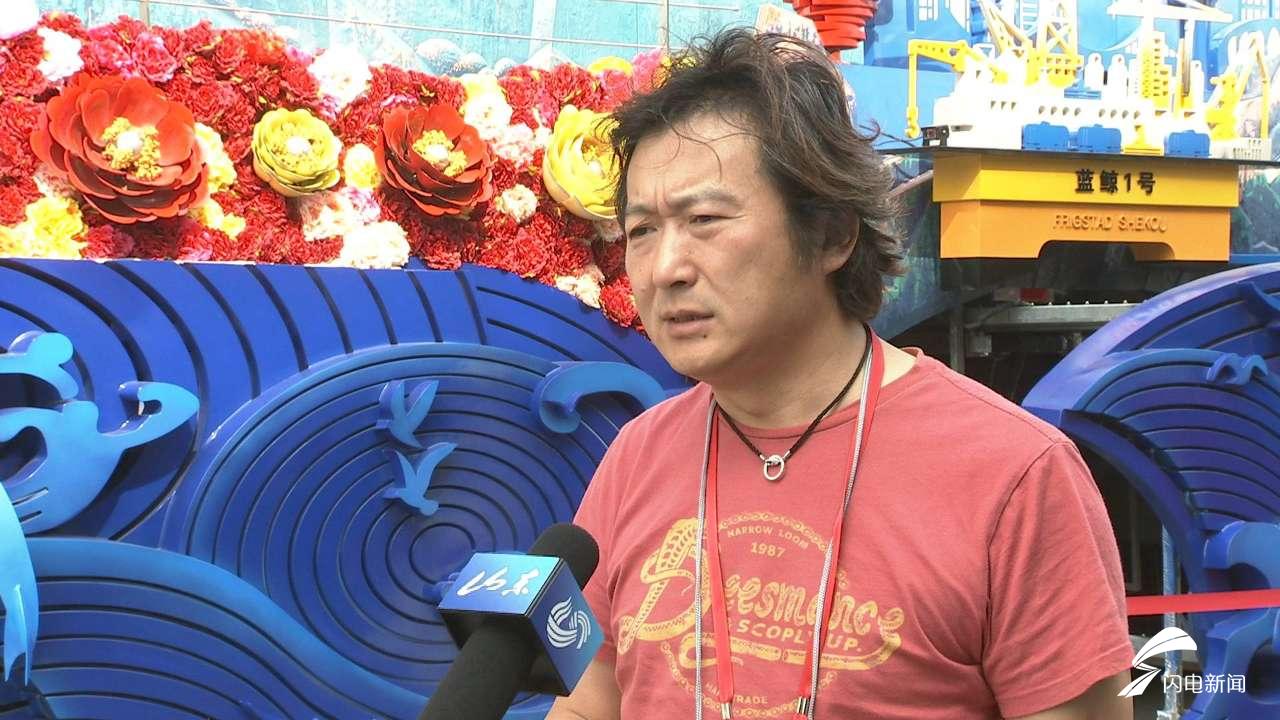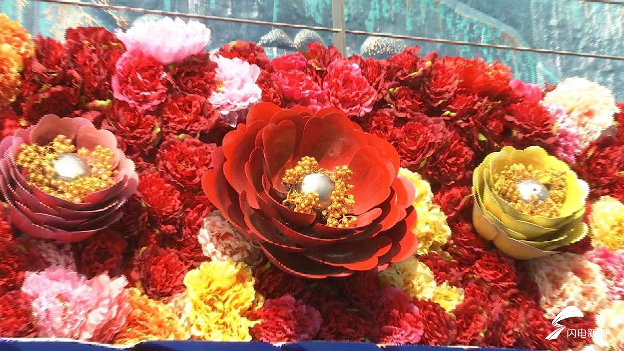 据山东彩车主创人员、山东艺术学院艺术实践与创作处艺术总监谷鹏介绍:“这个花是纯手工打造的,当时也考虑其他材料的,但都缺乏延展性,因为需要牡丹开合,有一些机械装置,还是考虑和山体一样用紫铜打造。”