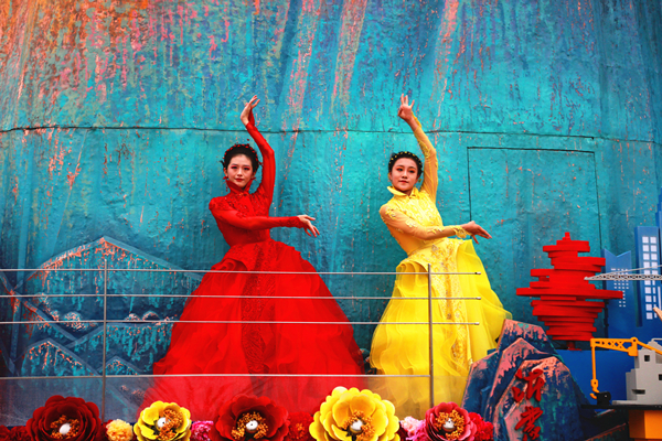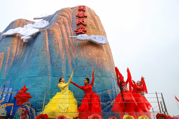 随后,举行了山东彩车“国泰民安”全要素的展演展示。山东艺术学院舞蹈学院12位学生在《我和我的祖国》《相亲相爱》热情高亢、振奋激扬的音乐声中,盛装进行了《沂蒙情颂,盛世华章》舞蹈表演,用舞蹈艺术深情传承演绎“沂蒙六姐妹”的动人故事,塑造牡丹花开的高贵典雅。演出得到了广大市民的热烈掌声和喝彩,观众们挥舞着红色的国旗一起高声合唱,将展演现场热烈欢庆的气氛推向高潮。