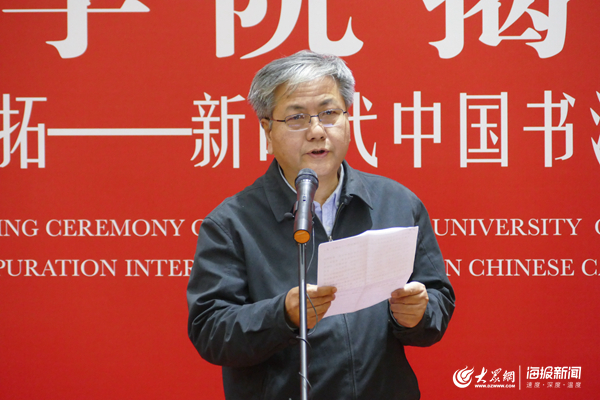 大众网教育·海报新闻讯(通讯员 王志军 王谦 王立燕 张顺智)10月19日,山东艺术学院书法学院揭牌仪式暨“传承与开拓——新时代中国书法高等教育国际论坛”开幕式在山东艺术学院长清校区举行。全国政协常委、中国书法家协会主席苏士澍,山东省政协副主席、党组副书记吴翠云,山东省委宣传部副部长程守田,中国书法家协会副主席、教育委员会主任翟万益,山东省文联党组书记王世农,山东艺术学院院长王力克共同为山东艺术学院书法学院揭牌,中国书法家协会分党组副书记、秘书长郑晓华宣读中国书法家协会贺信。揭牌仪式由山东艺术学院党委书记马东骅主持。