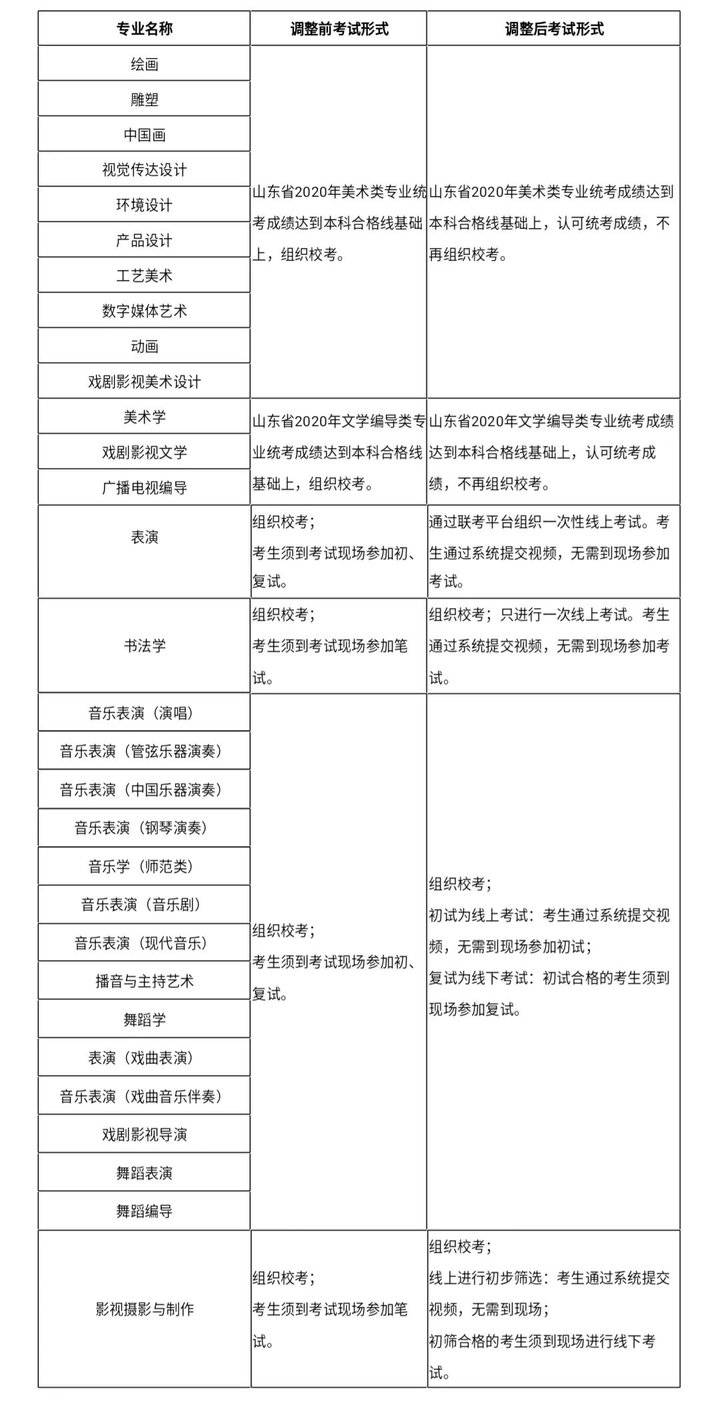 山东艺术学院2020年本科专业招生考试调整实施方案(省内)