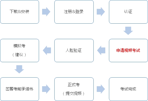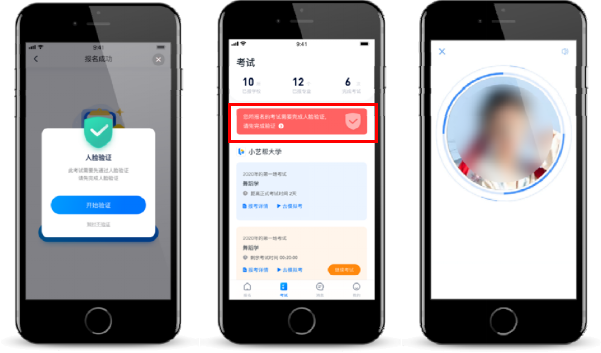 首次参加视频考试,需要进行人脸验证。系统会弹框提示,或在【考试】列表页上出现小红条,提示考生进行人脸验证。根据系统引导进行验证即可。人脸验证失败可以点击“人工审核”,请耐心等待人工审核结果。