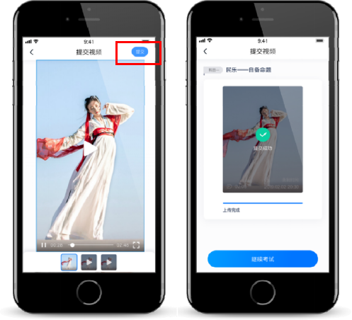 第四步,提交视频。每完成一个科目即可提交,视频上传时可同时进行其他科目考试,不用停留在上传页面, 后台会自动完成上传任务。