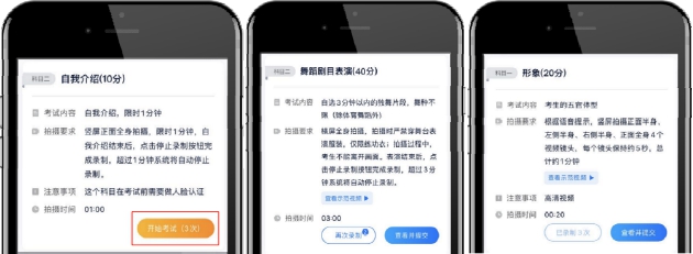1、指定考试项目,根据系统指导音完成,例如舞蹈基本功、个人形象等,考生只需要按步骤完成指定动作,即可完成录制。