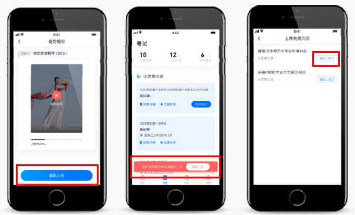 说明1,重新上传。如果视频上传失败,我们会提醒您【重新上传】,请留意视频上传页或【考试】列表页底部,点击【重新上传】即可。您可以切换 Wi-Fi 和 4G 网络进行尝试。