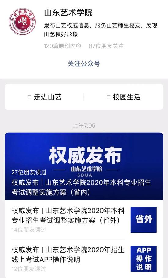 山东艺术学院2020年本科专业招生考试调整实施方案(省内)今早刚刚发布,据统计,今年省统考覆盖的13个专业取消现场校考,采用统考成绩。其它多个面试类专业采用线上考试,线上考试规模达3.5万人。