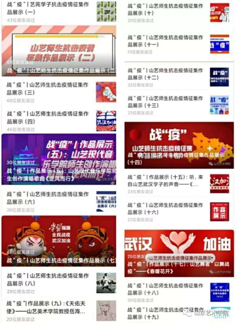 学校党委宣传部、团委等单位、部门通过广泛动员发动,作品在二级学院微信公众号与党委宣传部、团委公众号形成发布矩阵平台,山艺官方微信择优发布主题鲜明、创作精良的作品60期390部,阅读量达11.87万,经官方微博发布80期,阅读量达50万。全校各宣传平台广泛传播作品,凝聚师生共识,营造战“疫”必胜的舆论氛围。