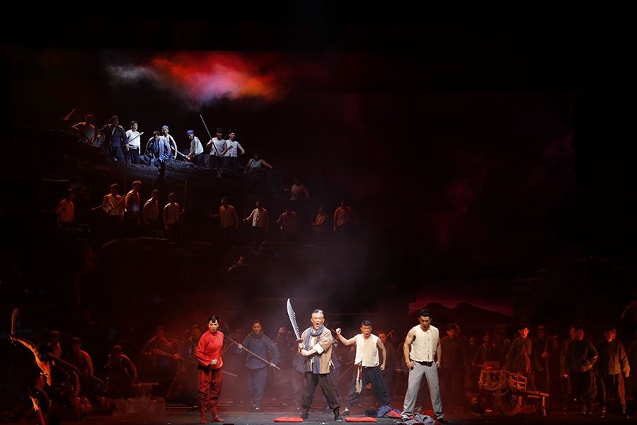 林生的英雄形象不仅表现在他义无反顾地参军去前线,还表现在他对妻子、对未出世的孩子的深深爱恋。在鬼子扫荡根据地的生死关头,他引开敌人,与敌人同归于尽。如果说林生代表了从村民到军人的成长和蜕变,孙九龙和赵团长,则一个是前线的英雄,一个是根据地的英雄,在他们的二重唱里,表现的是军民鱼水的深情厚谊,更是男子汉的铁骨铮铮。“一诺许下千金重,出口落地砸成坑。起誓不用对天地,只说一句俺保证。同生同死一家人,随时能拿命换命。”孙九龙兑现了承诺,当鬼子兵来搜查八路军伤员时,他和乡亲们义无反顾地替八路军赴死。沂蒙山的男人,把生命留给了子弟兵。他对于故土、对于亲人的无限留恋和侠骨柔情,在临死前一段咏叹调里得到了酣畅淋漓的表达,托起了孙九龙为代表的根据地人民的光辉形象。“再看一眼亲人,让我记住你的模样。再看一眼亲人,在这留下我的目光”,不惧死却不意味着不留恋生,相反,对生的留恋,更烘托了沂蒙山人民为子弟兵献出生命的决心和可贵。