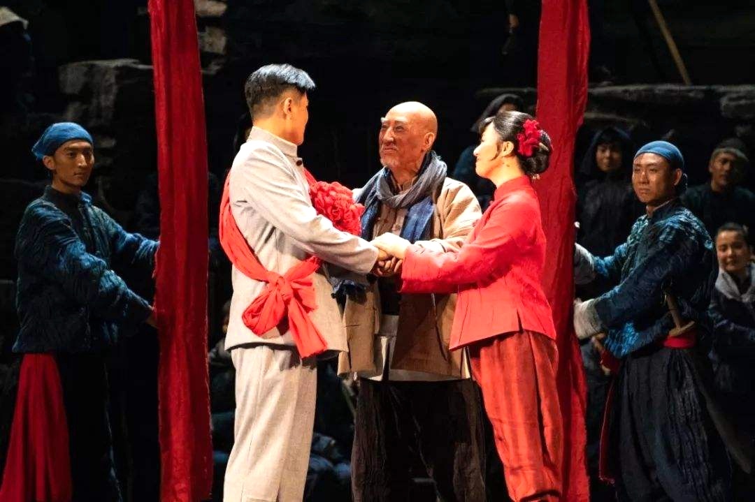 2.炮火硝烟中的浪漫主义精神。海棠和林生的婚礼,大喜遇上大灾,他们一边打炮,一边拜堂,“头炮拜天地,二炮拜高堂,三炮夫妻入洞房”。这样特别的婚礼本身是悲壮的,但是当一对年轻人心底充满了大无畏的乐观主义精神,它在舞台呈现上也就带有了浪漫主义的意味。