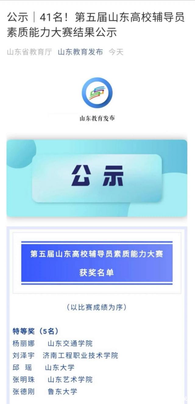 8月24日,第五届山东高校辅导员素质能力大赛在济南落下帷幕,山东艺术学院推荐参赛的辅导员张明珠老师荣获特等奖。来自全省各高校的122名辅导员老师参加了本次大赛,经过初赛、决赛,共评选出特等奖5名,一等奖15名,二等奖21名。