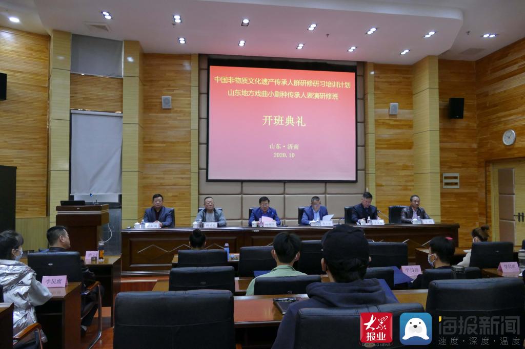 大众网·海报新闻讯 10月20日,由山东艺术学院承办的“文化和旅游部、教育部、人力资源和社会保障部中国非物质文化遗产传承人群研修研习培训计划”2020年山东省地方戏曲小剧种传承人表演研修班开班典礼在长清校区举行。山东省文化和旅游厅非遗处副处长蒋士秋,山东艺术学院副院长杨西国出席典礼,学校艺术实践与创作处负责人、戏曲学院党政负责人及研修班全体学员、戏曲学院师生代表参加活动。典礼由戏曲学院院长王文清主持。