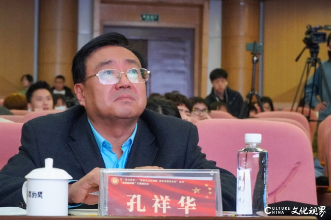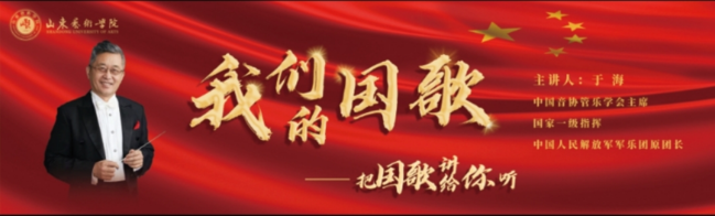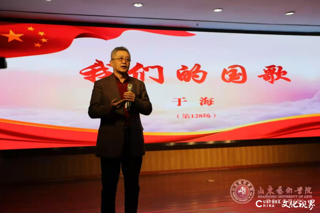 孔祥华在主持时说,于海先生以《我们的国歌》为题,用最朴素的语言、最艺术的表达、最真的情、最实的义,把国歌讲给我们听。为我们讲述了关于国歌最难得、最鲜活、最动听、最感人、最难以忘怀、最鼓舞人心的故事。这是一堂生动的思政课,入耳入脑,真切启迪我们坚定政治方向、涵养思想品德、走好人生之路;这是一次深情的爱国主义教育,入心入魂,真切教育我们挚爱伟大的国家、党和人民,弘扬中华民族气节,高扬爱国主义精神,励志报效祖国;这是一场精彩的报告会,入言入行,真切引领我们升腾对祖国的忠诚、对事业的追求、对奉献的责任。我们站在“两个一百年”奋斗目标的历史交汇点上,每一名中华儿女都为我们的伟大祖国感到骄傲,为我们的雄壮国歌感到自豪。让我们永远胸怀祖国,把家国情怀深深根植于我们的灵魂,自觉把个人的命运与国家民族的命运紧紧相连;让我们不忘初心,牢记为党育人、为国育才责任使命,努力工作、勤奋学习,用最勤劳、勇敢和创新的双手,把山东艺术学院建设好,为国家和山东省文化事业繁荣发展作出更大贡献;让我们高唱着《国歌》,弘扬伟大《国歌》精神和爱国主义精神,筑成我们新的长城,万众一心,为实现中华民族伟大复兴的中国梦而奋勇前进!