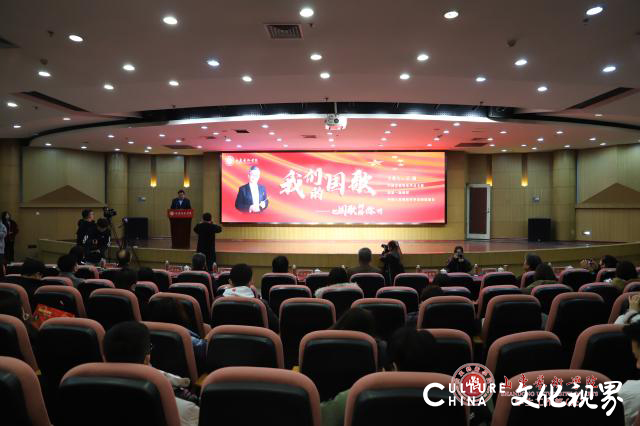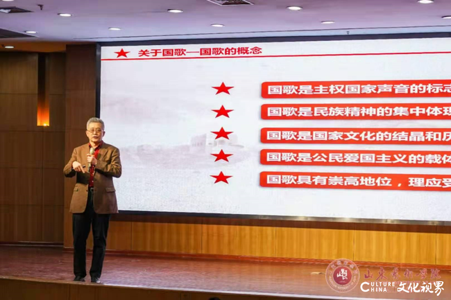 于海先生依次从“关于国歌”“中华人民共和国国歌的发展历程”“国歌是国家神圣的象征”“国歌是家国情怀的重要内容”和“我们的国歌是世界上最好的国歌”5个部分,为大家阐述了国歌之美及其重要性。“我们的国歌有84个字,37个小节,标准时长是46秒,这是每一个中国人都应该牢记的。”于海先生动情的说。围绕国歌产生的文化背景、历史渊源、地位意义等,他结合多年的实践经历,以叙事的视角生动地展开介绍。通过音乐播放与现场讲述相结合的方式,旁征博引地讲述了中外国歌的历史和典故,并通过分享《中华人民共和国国歌》(《义勇军进行曲》)创作历程和背后的故事,阐明了国歌所具有的崇高地位,展现了国歌作为国家声音的标志、民族精神的体现、国家文化的结晶和公民爱国主义载体的重要意义。他说,每一段国歌都有一段独特的故事,国歌也见证着那段光辉而艰难的民族岁月,国歌背后的一个个故事也蕴含着一个国家强大的力量。“《义勇军进行曲》体现了中华民族的光荣传统,产生了推动中国社会前进的巨大力量,它是各族人民共同的精神支柱。”报告会结束时,在于海先生的带领指挥下,全体师生起立,挥舞着国旗,情感饱满地唱响了激昂的《国歌》。