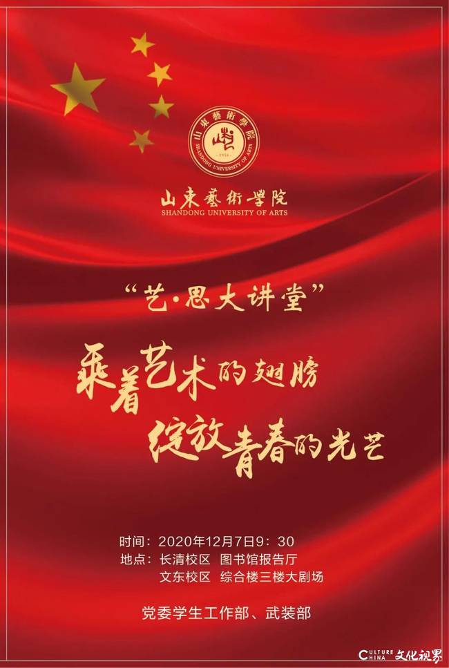 此次报告会,也拉开了山东艺术学院“艺·思大讲堂”——“乘着艺术的翅膀绽放青春的光芒”系列活动的序幕。“艺·思大讲堂”,将是立足艺术院校特点,凝铸艺术专业特色,依托学校“六艺育人”体系,着力打造的又一项“艺术+思政”育人品牌。 (王雯)