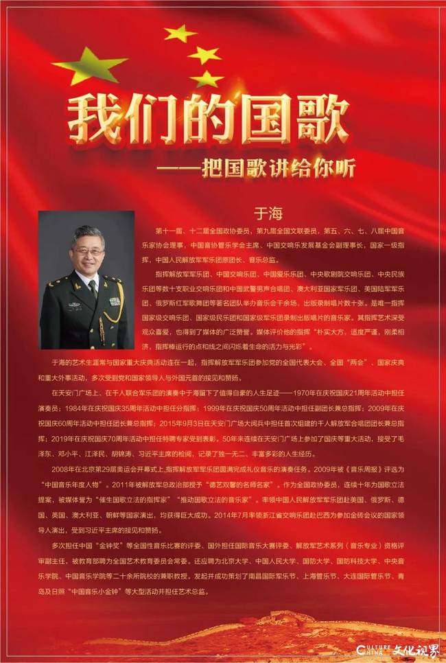 12月7日上午,著名音乐家、指挥家,国家一级指挥,第十一届、十二届全国政协委员,中国音协管乐学会主席,中国交响乐发展基金会副理事长,中国人民解放军军乐团原团长、音乐总监于海先生应邀莅临山东艺术学院为全校师生作了一场《我们的国歌——把国歌讲给你听》专题报告会,受到热烈欢迎。
