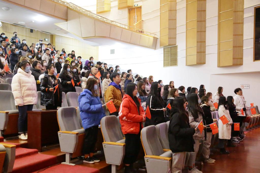 报告会结束时,在于海先生的带领指挥下,全体师生起立,挥舞着国旗,情感饱满地唱响了激昂的《国歌》。