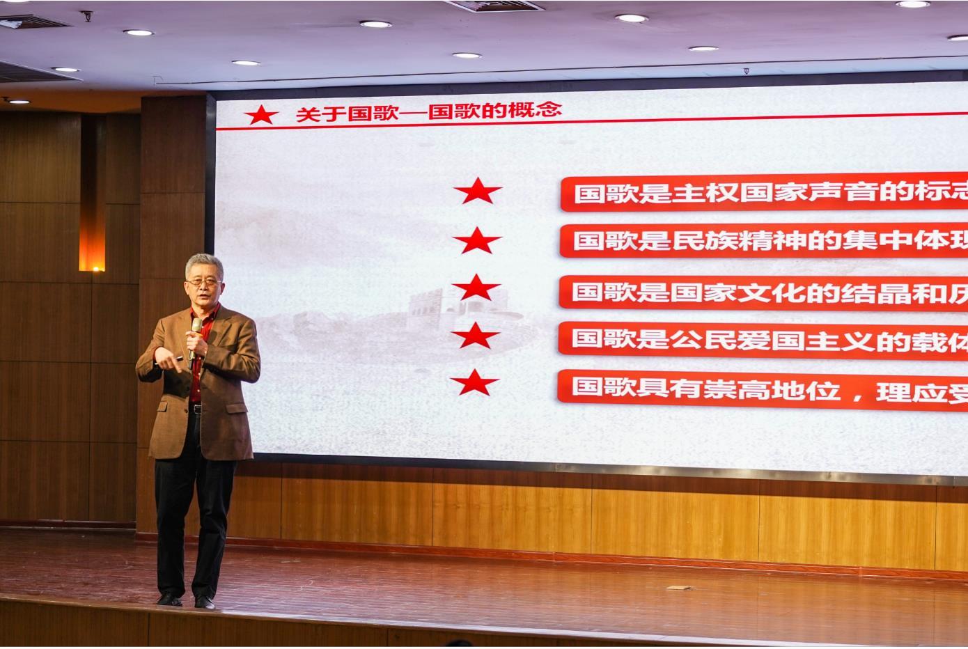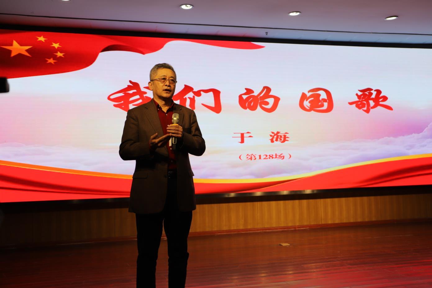于海先生依次从“关于国歌”“中华人民共和国国歌的发展历程”“国歌是国家神圣的象征”“国歌是家国情怀的重要内容”和“我们的国歌是世界上最好的国歌”5个部分,为大家阐述了国歌之美及其重要性。“我们的国歌有84个字,37个小节,标准时长是46秒,这是每一个中国人都应该牢记的。”于海先生动情的说。围绕国歌产生的文化背景、历史渊源、地位意义等,他结合多年的实践经历,以叙事的视角生动地展开介绍。通过音乐播放与现场讲述相结合的方式,旁征博引地讲述了中外国歌的历史和典故,并通过分享《中华人民共和国国歌》(《义勇军进行曲》)创作历程和背后的故事,阐明了国歌所具有的崇高地位,展现了国歌作为国家声音的标志、民族精神的体现、国家文化的结晶和公民爱国主义载体的重要意义。他说,每一段国歌都有一段独特的故事,国歌也见证了那段光辉而艰难的民族岁月,国歌背后的一个个故事也蕴含着一个国家强大的力量。“《义勇军进行曲》体现了中华民族的光荣传统,产生了推动中国社会前进的巨大力量,它是各族人民共同的精神支柱。”报告会结束时,在于海先生的带领指挥下,全体师生起立,挥舞着国旗,情感饱满地唱响了激昂的《国歌》。