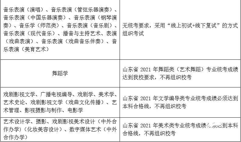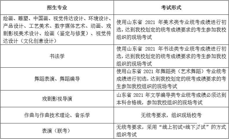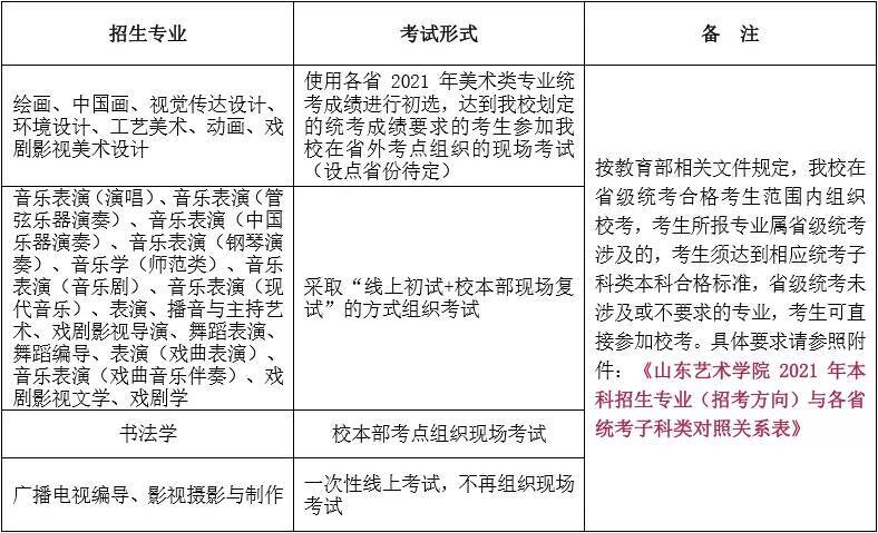 具体统考成绩要求、校考报名考试安排、考试科目、录取原则等相关信息将以《山东艺术学院2021年本科招生简章》形式,通过学校本科招生信息网站(http://zsbgs.sdca.edu.cn)、山东艺术学院官方微信公众号(sdca1958)向社会公布,请广大考生及时关注。