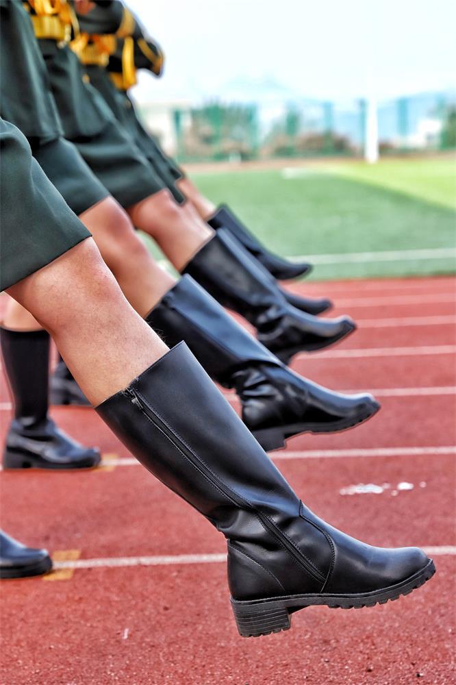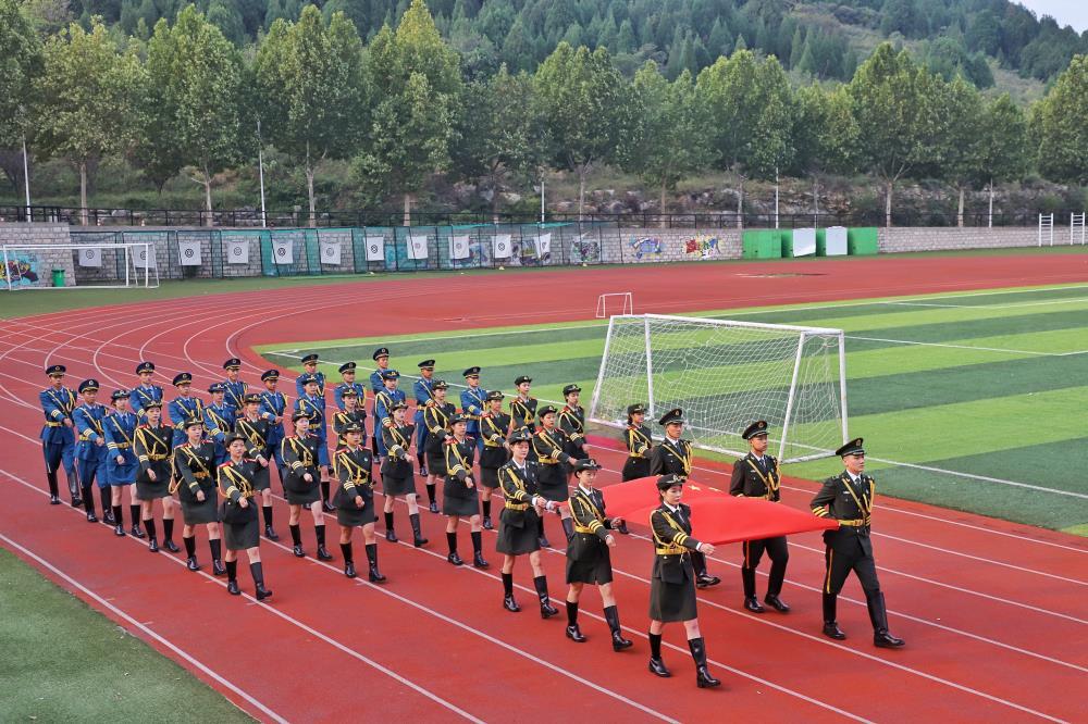 国旗护卫队踏步走在操场上,整齐划一,步幅一致