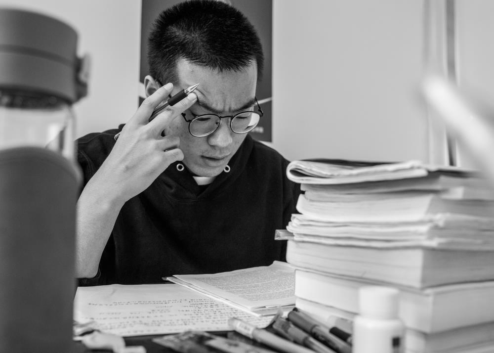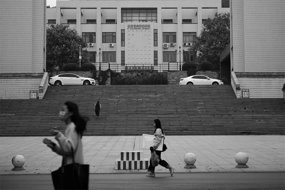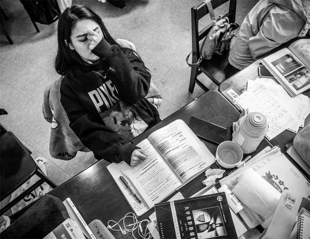 天气渐渐变凉了,楼道里的风刺骨的凉。很多同学为了多学几分钟,将学习阵地扩展到了宿舍楼道里。白天她们在图书馆、自习室学习,晚上和一些碎片时间就在楼梯口继续背书。(摄影:尹晓旭)