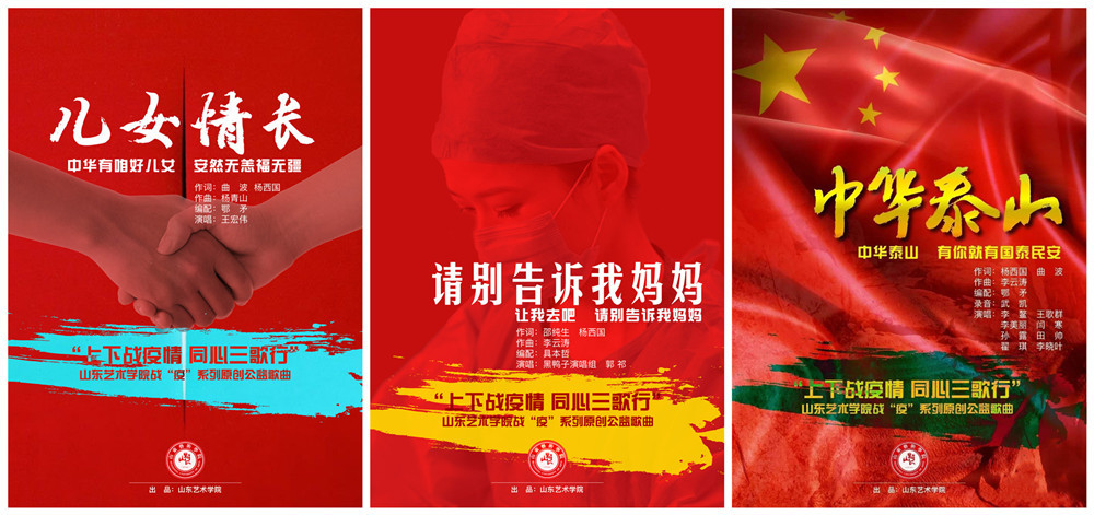 在新冠肺炎疫情发生后,山东艺术学院积极发挥高等艺术院校专业优势,组织开展了“共抗疫情、爱国力行”主题宣传教育和网络文化成果征集展示活动,用艺术作品驰援医护人员,歌颂抗疫英雄,增强战“疫”信心。通过山东艺术学院官方微信、微博发布作品140期390件。其中,“上下战疫情 同心三歌行”《儿女情长》《请别告诉我妈妈》《中华泰山》三首抗击疫情公益歌曲荣获教育部思想政治工作司“共抗疫情、爱国力行”主题宣传教育和网络文化成果征集展示活动歌曲类优秀奖,是该活动歌曲类获奖中唯一的山东高校。