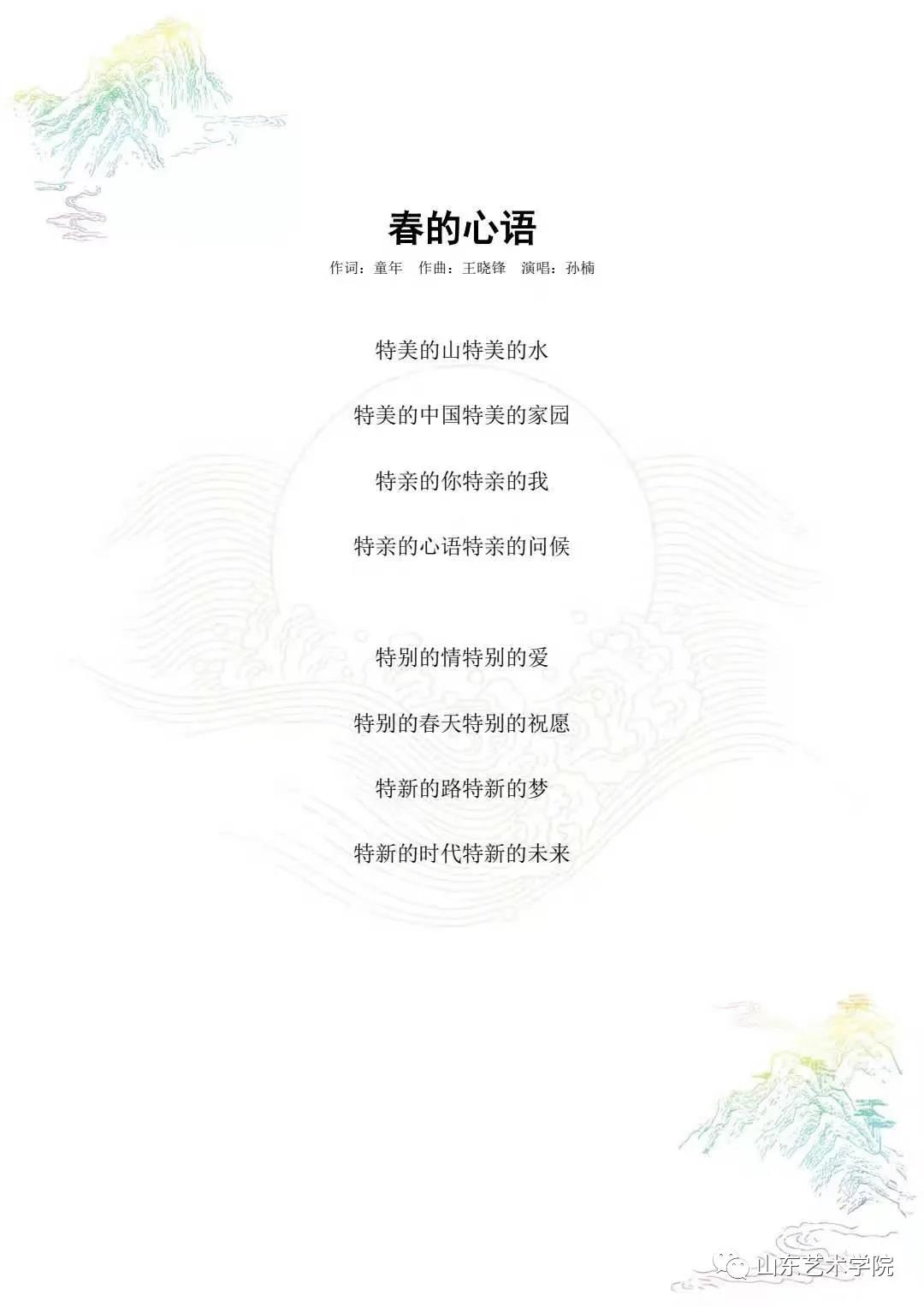 春晚歌曲《春的心语》由著名策划专家、影视导演、太阳圣火国际传媒创始人、我校客座教授、杰出校友童年先生作词,歌曲的创作源于欣逢中华民族伟大复兴特新时代的真挚情感,又遇世界共同抗疫特殊时期的真诚情牵,用“特”字巧妙地展开叙述:在这个特别的年份,我们不畏艰险,不惧困难,不辱使命,勇敢前行。深情地表达了人民和领袖的心语诉说,诗意地传达了对同胞的爱心祝福和美好祝愿。歌曲旋律有记忆点,在曲式上运用四三拍来体现旋律的流畅性,使听众为之感动。