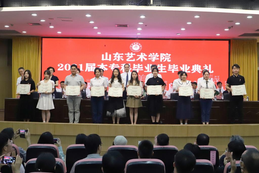 典礼上,杨西国宣读了《关于表彰2021届优秀毕业生的决定》《关于授予刘洪铖等同学“山东艺术学院优秀青年志愿者标兵”称号的决定》和《关于表彰山东艺术学院2021届“十佳优秀毕业生”的通报》,对137名省级优秀毕业生、416名校级优秀毕业生和3名学校优秀青年志愿者标兵、2021届“十佳优秀毕业生”进行了表彰。学校领导为优秀毕业生代表,参加西部计划的优秀志愿者标兵刘洪铖、张敬轩、梁孝慈,“十佳优秀毕业生”马磊、王倩、成亚生、吕升虹、刘凯迪、刘逸群、刘雅然、李朝阳、张元、曹传琛同学颁发了荣誉证书。“十佳优秀毕业生”向任课老师敬献鲜花并合影留念。