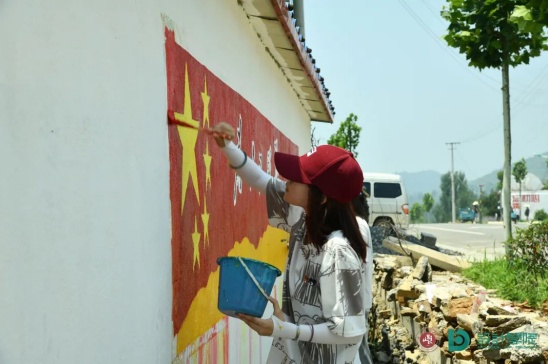 学生们首先来到下村乡花园新村进行艺术文化墙绘。花园新村村民帮助搭起脚手架,还送来扇子、凳子。学生们不顾酷暑,积极投入到“美丽田园”乡村墙绘工作中。在绘制过程中,虽然提前准备了防暑和防蚊用品,学生们仍然大汗淋漓,有的被日光晒黑了,有的被蚊虫叮得满腿是包,但没有一名同学打退堂鼓,一天的时间完成了七幅画作,看着一幅幅艺术作品扮靓了乡村的大街小巷,一面面单调的白墙穿上“新衣”,同学们脸上露出了满意的笑容。同时,花园新村的村民们纷纷走上街头驻足欣赏,村民们向同学们竖起了大拇指。