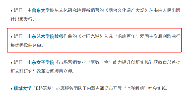 近日,山东艺术学院教师作曲的《对阳光说》入选“唱响百年”爱国主义原创歌曲征集优秀歌曲名单。