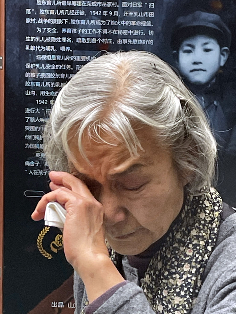 10月20日,在山东济南举行的纪录电影《战争中的母亲—胶东乳娘》首映式上,乳儿宋玉芳在海报前激动落泪。