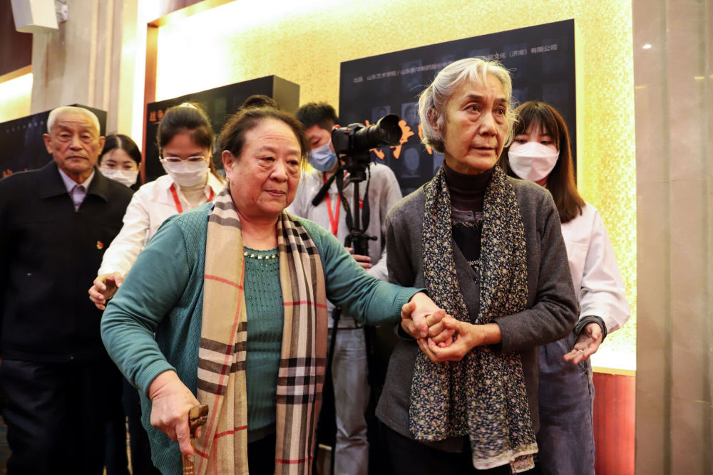 10月20日,在山东济南举行的纪录电影《战争中的母亲—胶东乳娘》首映式上,影片部分主人公、乳儿于志荣(前排左一)与宋玉芳(前排左二)在活动现场。