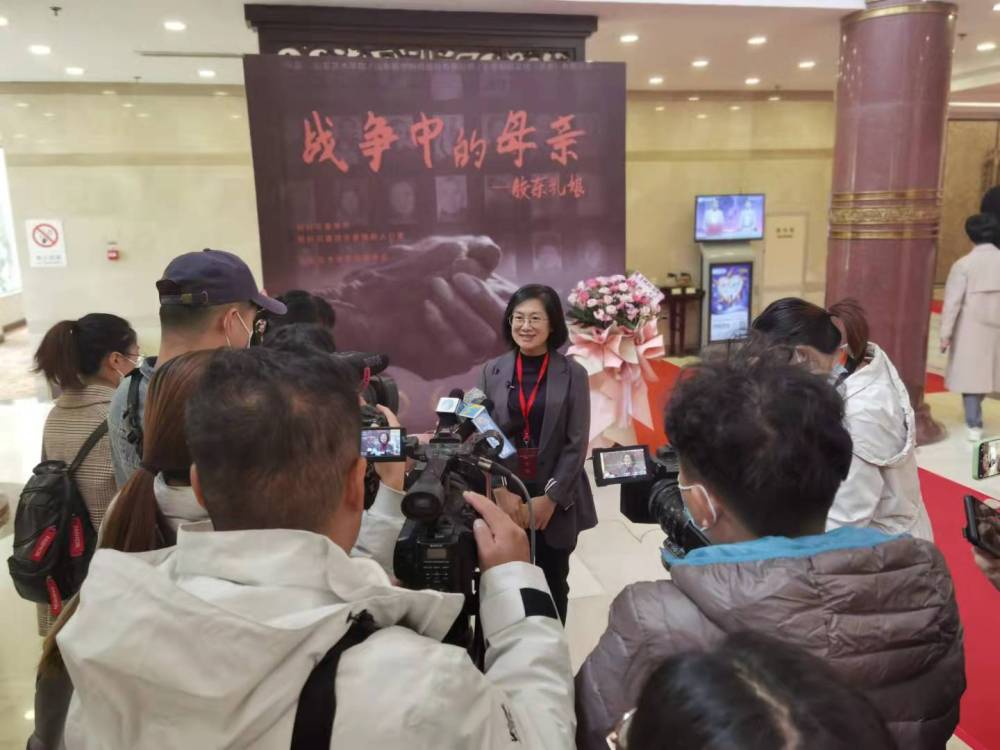 10月20日,在山东济南举行的纪录电影《战争中的母亲—胶东乳娘》首映式上,影片导演常秀芹在接受媒体采访。