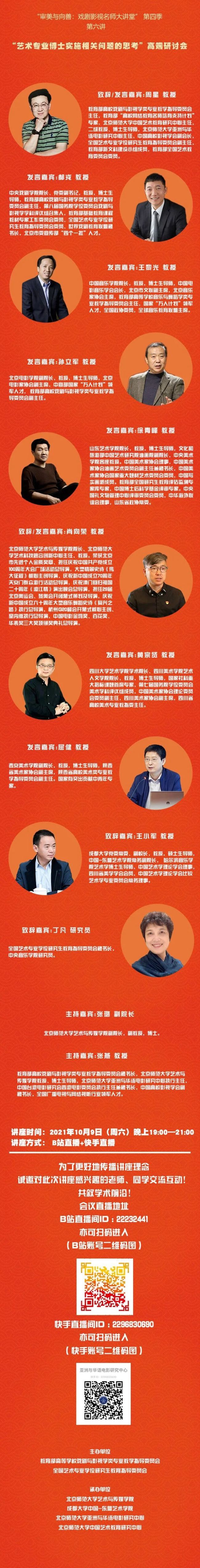 2021年10月9日晚上7点,由教育部高等学校戏剧与影视学类专业教学指导委员会联合全国艺术专业学位研究生教育指导委员会共同主办,由北京师范大学艺术与传媒学院、成都大学中国-东盟艺术学院、北京师范大学亚洲与华语电影研究中心、北京师范大学中国艺术教育研究中心共同承办,“审美与向善:戏剧与影视学名师大讲堂”系列讲座第四季第六讲,在B站、小鹅通和“北师大亚洲与华语电影研究中心”快手账号等多个平台同步直播。