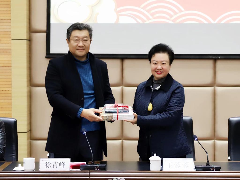 北京京剧院一团团长、张派领军人、著名京剧表演艺术家王蓉蓉教授在致辞中谈到,山东是京剧艺术的沃土,自己和山东的京剧情缘非常深厚。作为山东艺术学院的客座教授,自己将毫无保留把几十年学习、实践和研究张派艺术的收获,倾囊教授给山艺的教师和学生们,把此次“名家传戏”项目做好,为山东艺术学院戏曲专业的教学和人才培养尽自己的一份力量。随后,王蓉蓉教授将自己珍藏的京剧《状元媒》剧本、《党的女儿》黑胶唱片和《沙家浜》演出光盘赠与山东艺术学院。