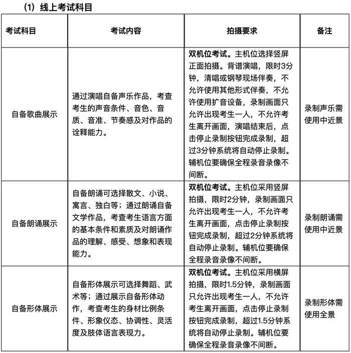 在考试要求方面,线上考试过程中,考生须保证作品的真实性,视频录制不得转切、不得编辑美化。线上正式考试前,每一名考生均须签订考试诚信承诺书,未签订者取消考试资格;正式视频录制中,考生要严格按照拍摄要求进行视频录制,不得离开拍摄画面,不得出现任何显示考生信息的提示性文字、图案、声音、背景、着装等,更不得出现考生姓名、考号等个人信息,否则将被视为违规,并取消考试资格,考生录制视频环境等其他客观因素不影响专业成绩评定。