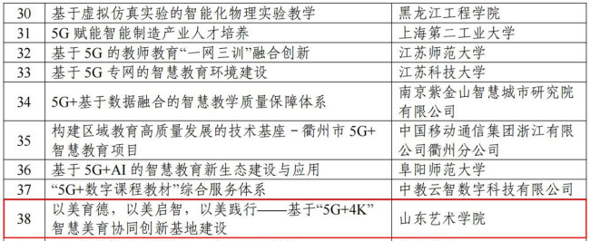 1月27日,工业和信息化部信息通信发展司、教育部科学技术与信息化司发布了《2021年“5G+智慧教育”应用试点项目入围名单公示》,山东艺术学院申报的《以美育德,以美启智,以美践行——基于“5G+4K”智慧美育协同创新基地建设》项目成功入围,是全国唯一一个由艺术院校牵头的项目。