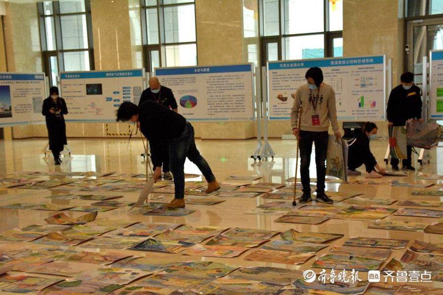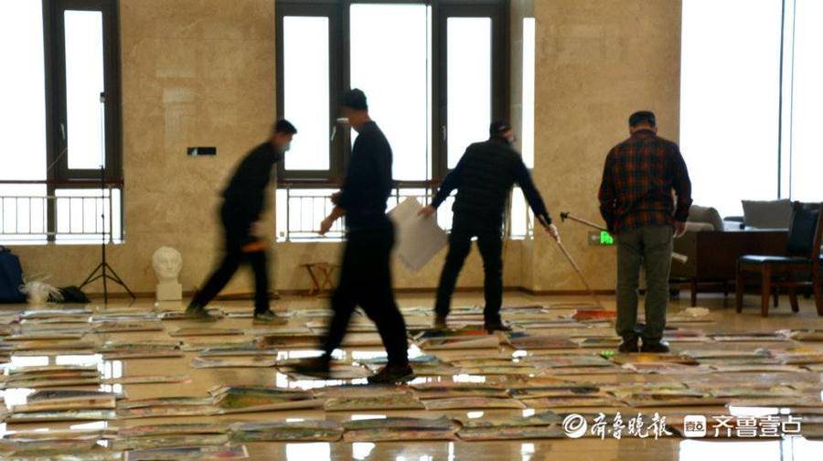 在山东省委党校的阅卷现场,工作人员正将一幅幅学生们的考试作品摆放在地上,众多绘画作品铺了满满一地,这些作品都是山东艺术学院今年美术类考生的考试作品。