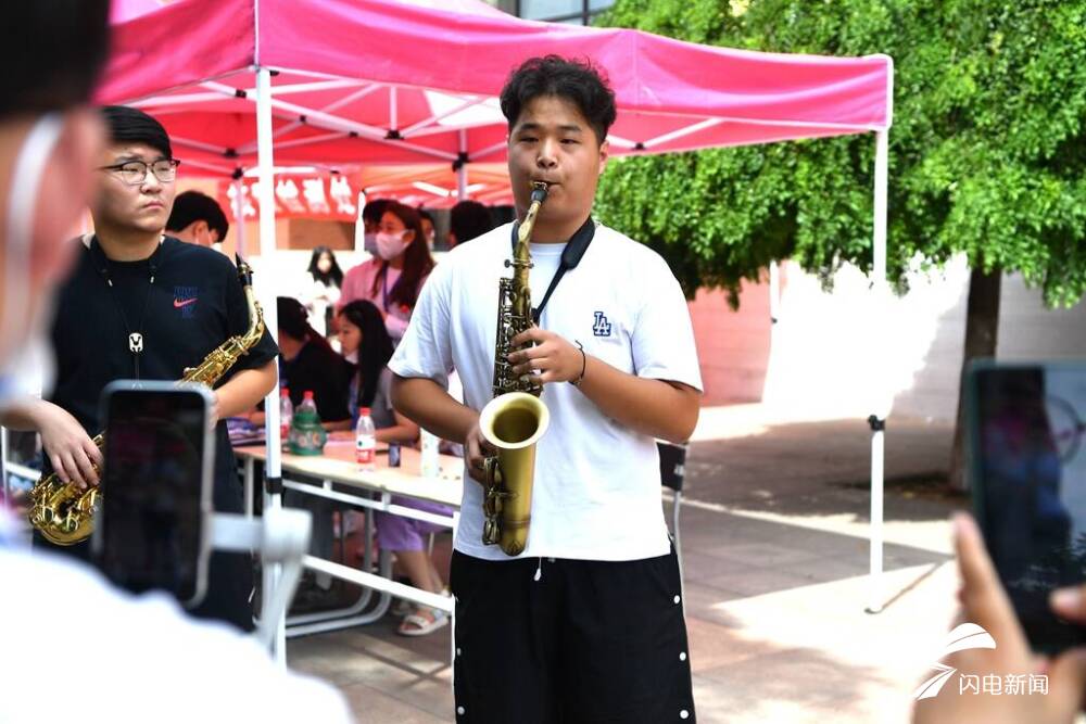 来自济南的张宇星和河南焦作的赵芫是山东艺术学院流行音乐专业校考专业课成绩的省内第一和省外第一,两人与同学一起在广场上演奏起萨克斯,让不少学生驻足欣赏。