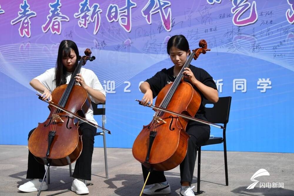 来自青州同一所高中的郭孟琦和韩彤,凭借大提琴演奏一起考上了山艺,在报到处的展板前,她们拿出大提琴,为师生演奏。
