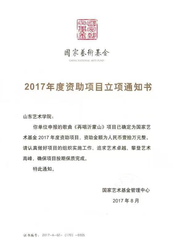 2017年《再唱沂蒙山》荣膺国家艺术基金奖励的原创歌曲,被冠誉“中国新时代的沂蒙山小调”美称。歌曲一经问世,立刻在社会上引起强烈共鸣,很快就火遍了华夏大地、大江南北,不断随演出传唱而广泛传播,乐团演出到哪里,就有不同的歌唱家或歌手唱到哪里。