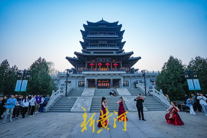 下午18:14,距离超然楼亮灯还有6分钟。突然,一队穿着华服的女子怀抱提琴鱼贯而入,在超然楼阶前站定后,充满青春气息的《G大调弦乐小夜曲》和高亢嘹亮的哈萨克族民歌《玛依拉》接续上演。