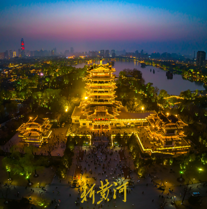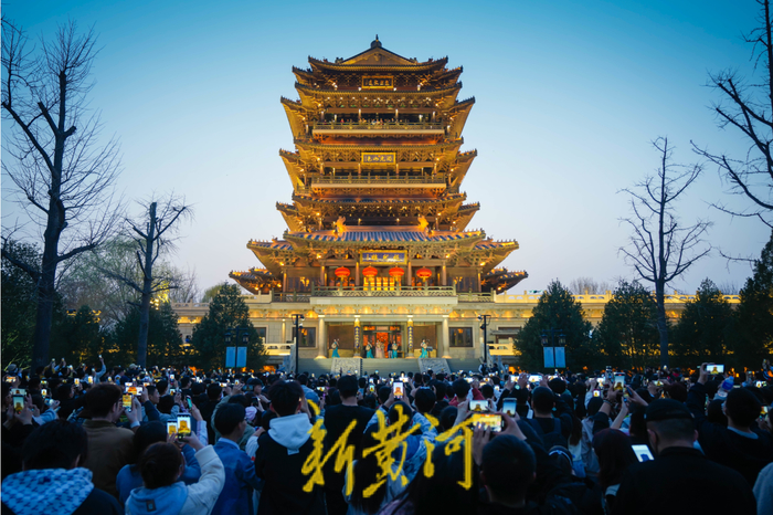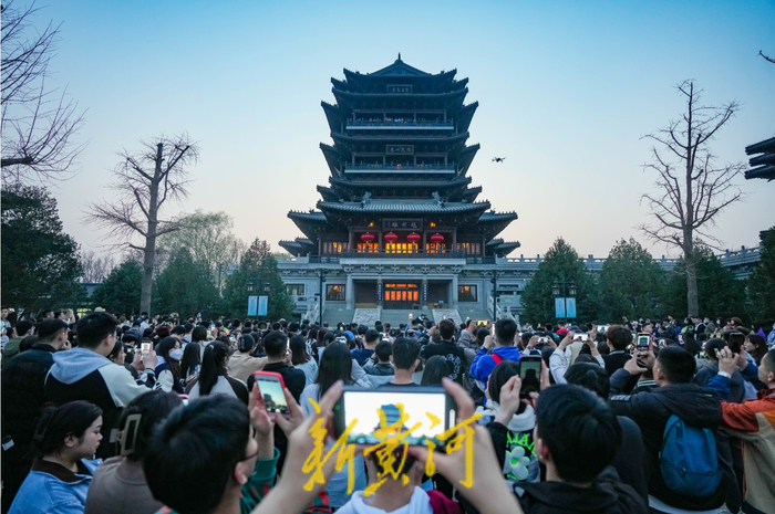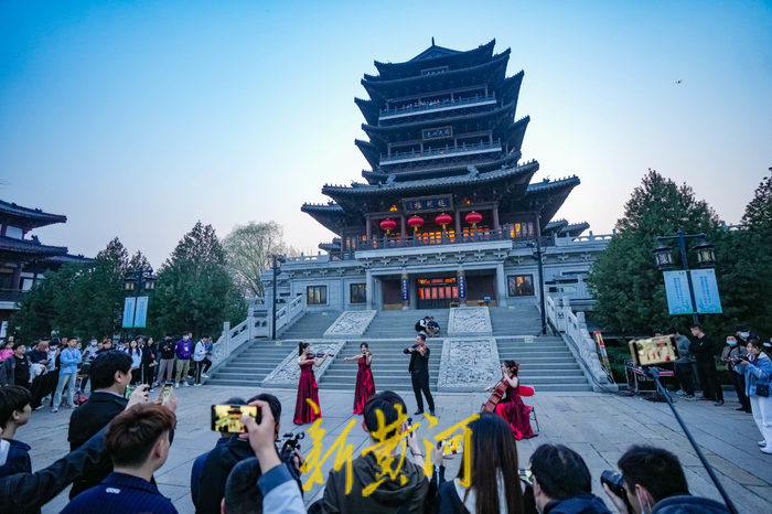 两曲奏罢,超然楼瞬间“点燃”,先是一点,再到一面,最后是一片,璀璨辉煌,现场惊呼一片。精彩未完——就在此时,超然楼中,10位汉服仙子翩然而出,她们怀抱琵琶、中阮,献上一曲诗意十足的《春江花月夜》。