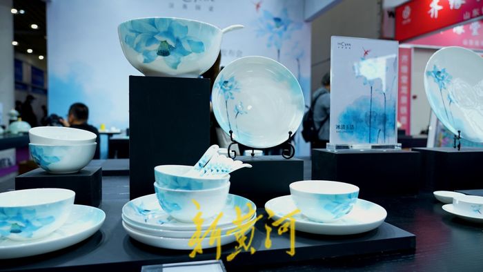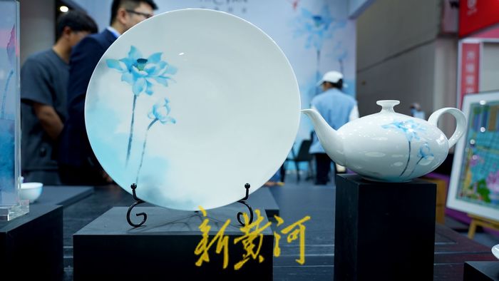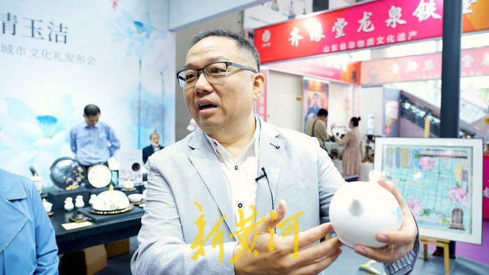 2023山东工艺美术展暨“山东手造”精品展正在济南举办,开幕式上淄博市带来了十款文化“两创”新品,其中汉青陶瓷的“冰清玉洁”荷花杯以清新雅致的风格吸引了很多人的眼球。这款作品的作者是一对母子——山东艺术学院教授李百钧与山东艺术学院教授、硕士生导师、城市艺术与创意学院院长王大海。现场,新黄河记者对两位艺术创作者进行了专访。
