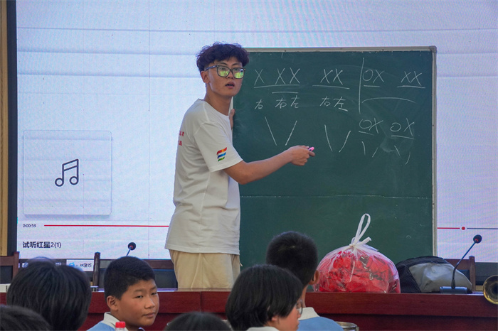 进行艺术支教,美育筑梦未来。实践团来到牡丹区沙土镇第二十二中学和赵庄小学开展了理论宣讲、支教、推广普通话等活动。在理论宣讲中,“艺启”志愿服务团宣讲了“两弹一星”精神,还结合小学教材中课文《灯光》,把学校第一书记考证的沙土集战役“郝副营长”的故事讲解给孩子们;在美术课上,队员们讲解了中国传统服饰云肩,通过自己动手制作云肩让同学们感受中国传统服饰的魅力,增强对中国传统文化的热爱;在音乐课堂上,队员们带领二十二中鼓号队进行训练,完成了《少先队鼓号队总谱第三套出旗曲》《红星闪闪》的学习;实践团成员还精心设计了教学环节,利用播音主持课堂,带领学生们进行普通话训练,“推普”助力乡村振兴。