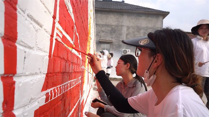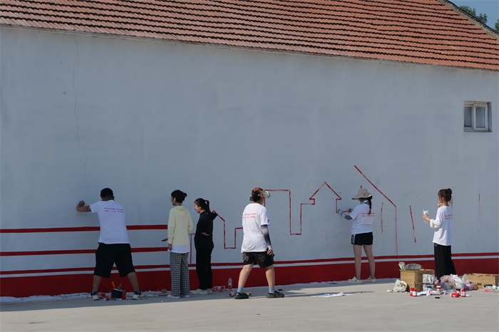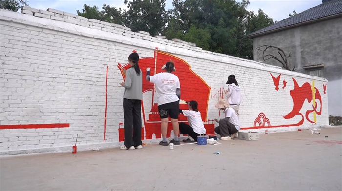 开展文化墙绘,共建和美乡村。实践团围绕党建和乡村振兴主题,迎着高温酷暑,自备画笔、颜料等物资,在沙土镇穆谢庄行政村和赵庄行政村开展主题墙绘。经实地考察,实践团根据当地需求制定出一套完善的墙绘方案。起稿定型、涂底上色、精描图案,队员们分成3个小组,分工明确、配合默契,认真勾勒每一处细节,一幅幅精美的画面徐徐展开,引来村民纷纷围观称赞,为乡村添加亮丽色彩,也在潜移默化中涵养了村民的精神。