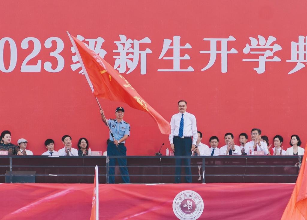 上午9时30分,大会在雄壮的国歌声中拉开帷幕。王洪禹等领导为2023级新生代表佩戴校徽,表达了学校对全体新生的真诚欢迎和美好祝福,标志着他们以“山艺人”的身份开启了艺术追梦之旅。